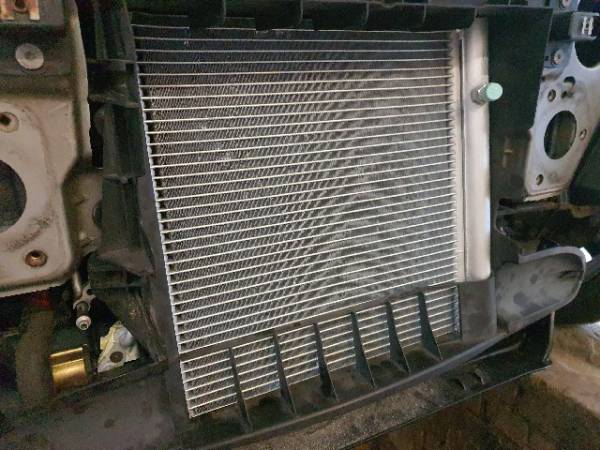 4. Der Kondensator sitzt direkt vor dem Kühler. Um diese voneinander zu trennen, muss das Plastikteil, welches sie zusammenhält auseinandergetrennt werden. Dazu einfach die Schrauben lösen (von hinten am Kühler). Beides kann dann abgesenkt werden.