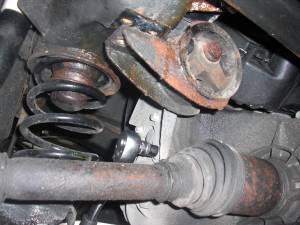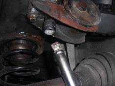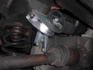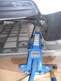Nachdem das Lager montiert ist, Wagenheber auf das Achsrohr setzten, anheben und Querstrebe montieren.