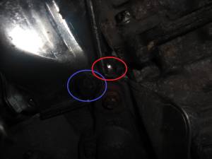 Weiters bin ich in eine „Falle“ getappt. Die auf dem Bild blau umrandete und bereits montierte Schraube soll natürlich nicht in die rot markierte Öffnung. Man versucht sonst vergeblich das Lager auf Position zu bringen… Insbesondere wenn man mit dieser Schraube beginnen möchte.