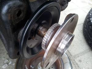 Zentrale Achsschraube leicht lösen, ebenfalls die Radmutter. Dann Smart aufbocken. Oder erst aufbocken und Schlagschrauber nehmen. Bremssattel ausbauen und aufhängen, siehe Anleitung zur Erneuerung der Bremse. Scheibe abnehmen.