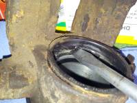 Die defekte Manschette aushebeln. Auf dem Foto wurde die Gummilippe mit einem Messer ausgeschnitten um den Arbeitsbereich besser sehen zu können. Nun mit einem Schraubendreher aushebeln.