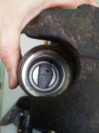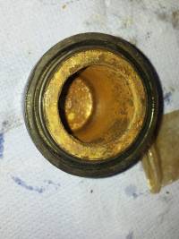 Verrostete Stellen werden mit feinem Schleifpapier gereinigt. Besonders im Einpressbereich der neuen Lippe war ein bisschen was zum entfernen. So sieht mit Bremsenreiniger gespültle Kolben von Innen aus. Alle Rostkrümel welche hineingefallen sind mussten wieder heraus. Das am Rand liegende Loch am Boden ist im eingebauten Zustand oben und ist für die Entlüftung zuständig, das andere führt zum Anschlussbereich des Bremsschlauches.