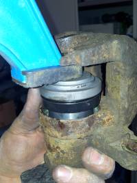Der Dichtring lässt sich ganz leicht wechseln (oben auf dem Foto unterhalb vom Schraubendreher). Alten mit kleinem Flachschraubendreher aushebeln und neuen einsetzten - mit Einbaupaste, z.B. ATE Bremszylinderpaste benetzen. Bei dem verwendeten Einbausatz war etwas Fluid dabei, allerding sehr wenig (hätte gerade so gereicht). Es werden ebenfalls Kolben und der Rand des einzupressenden Simmerrings benetzt.