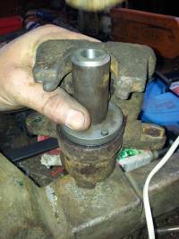 Mit der Platte kann der Simmerring jedoch nur bis auf Anschlag mit dem Kolben gebracht werden, dieser schaut nämlich zwei bis drei Millimeter nach außen, so dass eigentlich noch ein Rohr (oder eine Platte mit Loch) verwendet werden muss, um diesen komplett korrekt in Position zu bringen.