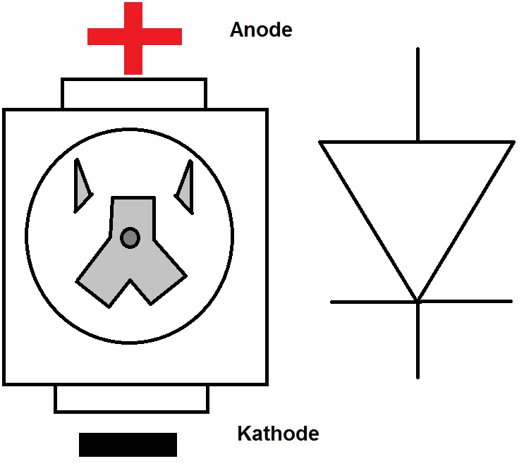 Für LED-Modifikationen ist es einerseits wichtig die Spannung der ursprünglichen LEDs zu kennen, als auch die Polarität, da nach dem Lichterketten-Prinzip mit nur einer falschen oder defekten LED sämtliche LEDs ausbleiben und man sich wundert, wo denn Nachts der Drehzahlmesser hin ist. Die ursprünglichen LEDs sollten folgende Variante von Osram sein. Die Polarität, sowie die ursprüngliche LED-Farbe kann man anhand des untenstehenden Bildes herausfinden bzw. ablesen. Der Pfeil, der verwendet wurde soll lediglich ein Dioden-Schaltzeichen darstellen, wie weiter unten aufgezeigt. Zusätzlich kann man die Polarität der Original LEDs durch den internen Aufbau herausfinden, da die Anode zwei „Hörner“ besitzt, während die Kathode ein gedrehtes Y besitzt.