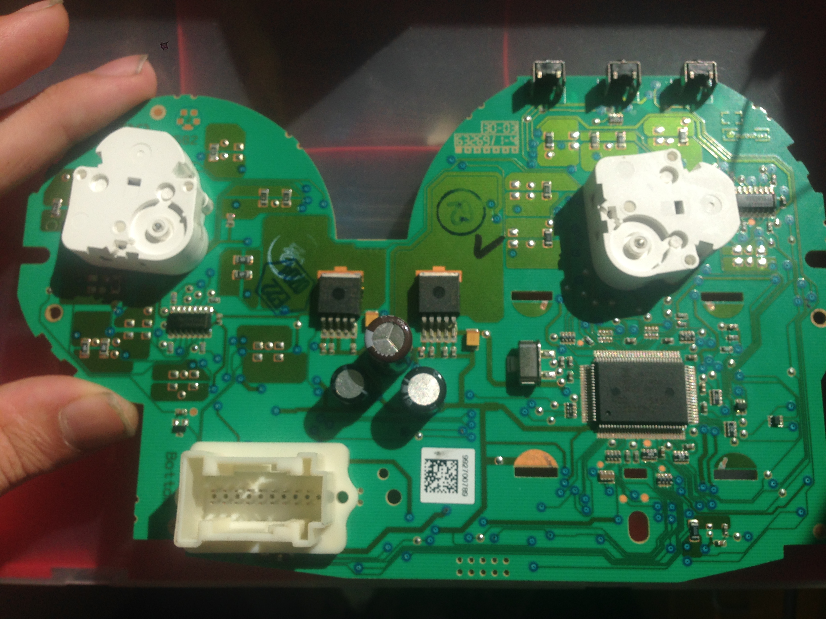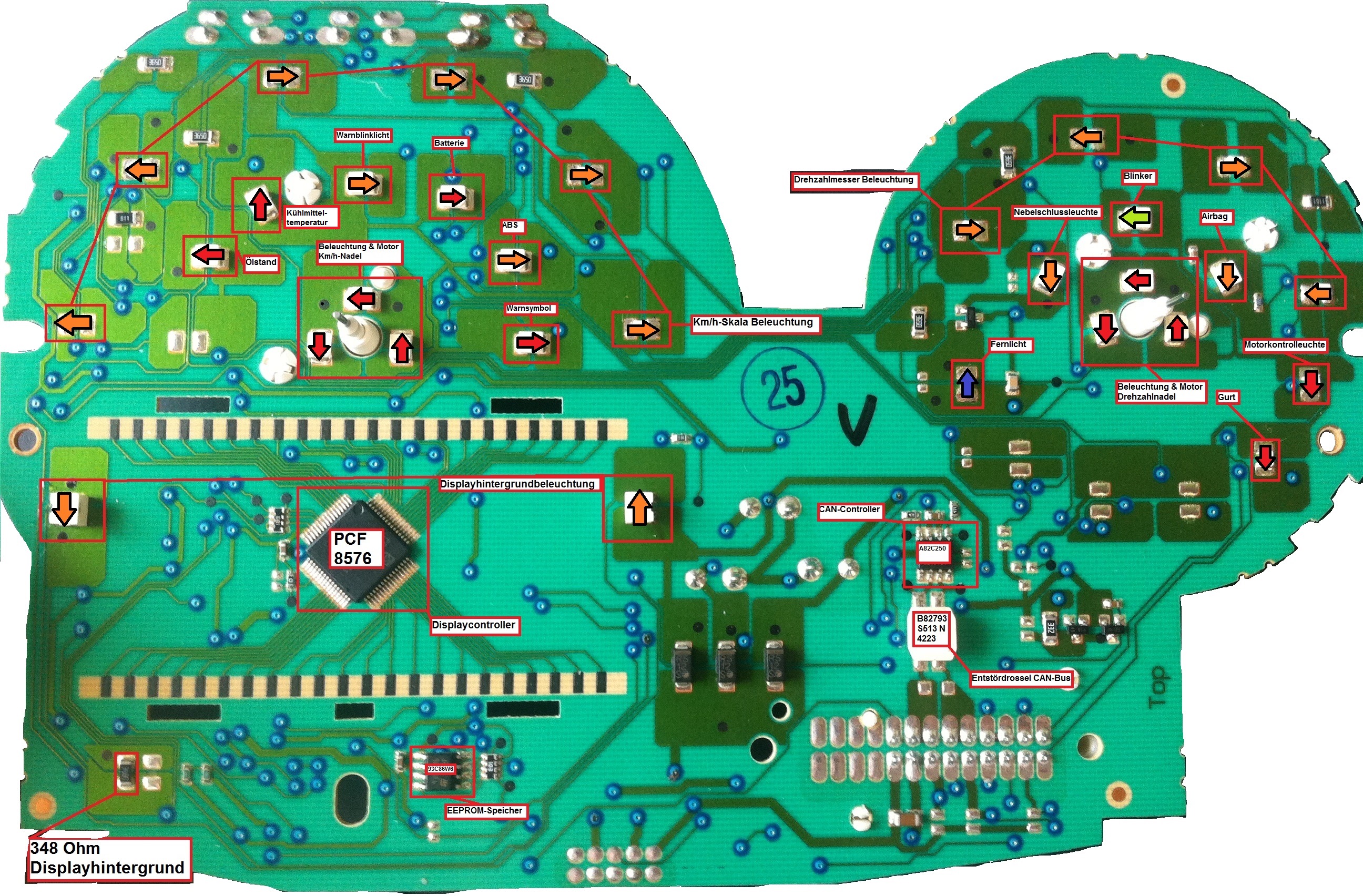 Ansonsten finden sich diverse Halbleiter wie Transistoren und Dioden bzw. Leuchtdioden auf der Platine, als auch passive Komponenten wie Widerstände, drei Elkos, ein Quarz und eine CAN-Bus Entstördrossel B82793 S513N. An der Oberseite befinden sich zudem drei Buttons, mit welchen das Kombiinstrument bedient wird. Erwähnenswert sind außerdem die Miniaturmotoren links und rechts mittig auf der Platine, welche die Nadeln bewegen.