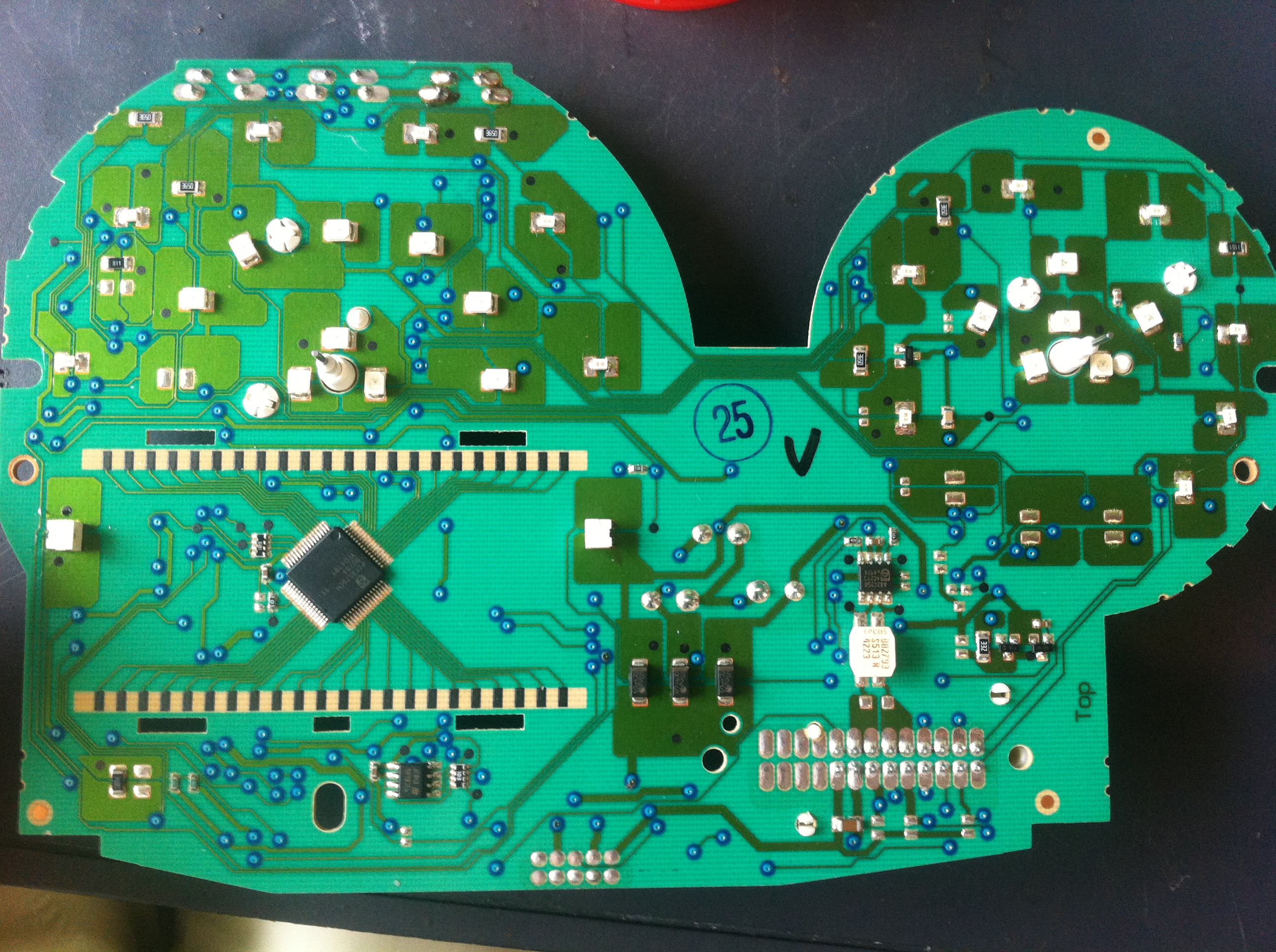 Bei der Platine des Kombiinstruments handelt es sich um eine Double-Layer Platine mit Durchkontaktierungen und Voll-SMT-Bestückung, mit Ausnahme der drei Elkos und der Buchse. Sie hat die ungefähren Maße von 120x190mm und eine Dicke von ca. 1,6mm. Die Form erinnert an einen Dreiviertelkreis, einen Halbkreis und ein Rechteck. Es sind außerdem über die Platine verteilt Testpads aus Graphit vorzufinden, die vermutlich an wichtige Leitungen angebunden sind.