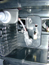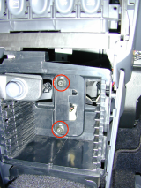 Schubladen (CD, Aschenbecher) herausnehmen. Dazu hinter die Laden fassen, die an der Lade hinten horizontal verlaufende weiche Plastikverstrebung nach vorne ziehen und gezogen halten. Dann die Lade nach vorne herausziehen.