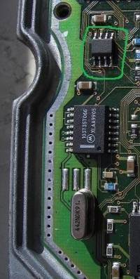 neben dem Flash, da wo das Programm und die Kennfelder drin sind, hat das MEG auch noch ein EEprom (24C02 Chip) wo die FIN, die Codierung, statistische Daten (Kupplung, Lambda usw.) und Werte die beim Stromausfall erhalten bleiben sollen, gespeichert sind (das EEprom ist auf dem Bild grün umrandet).